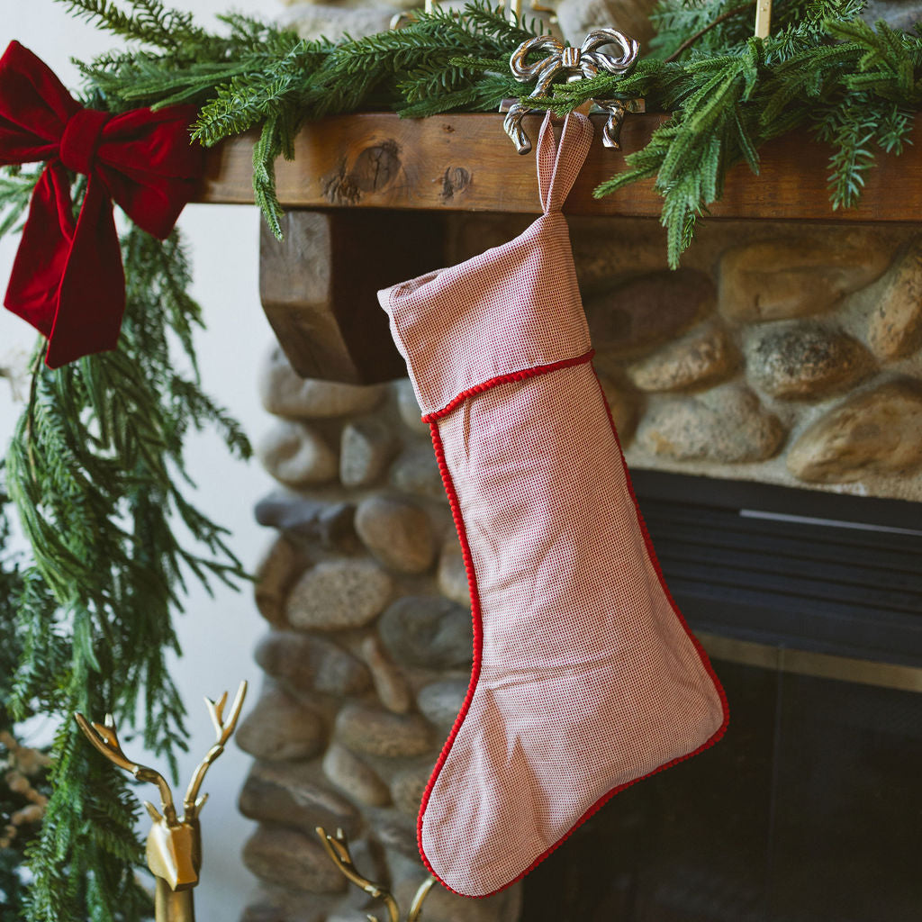 Woven Cotton Stocking with Red Pom Pom Trim